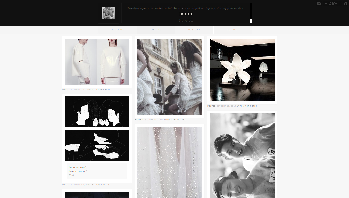 My favourite tumblrs are the clean looking, aesthetic ones, the ones that post the clothes I want in my dream wardrobe, the ones that post the anime I like to watch, and the photos that I want to learn how to take. Also the fandom blogs, but they’re less ~inspiring~ and more for my own gratification, really.